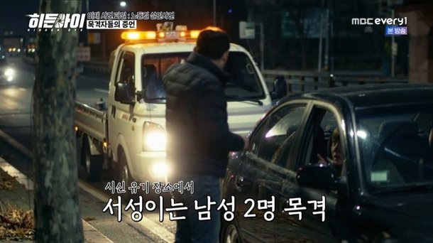시체가 발견되기 2시간 전인 2006년 7월 3일 오전 12시경 시체 발견 장소 근처 노들길에 있던 견인차 기사 김 씨는 도랑 근처에 어두운 색의 아반떼 XD 차량이 주차되어 있었으며 한 남성은 하수구 옆에 서성거리고 있었고 나머지 한 사람은 선팅 된 차 안 운전석에 있었다고 증언했습니다. 김 씨가 그 모습을 보고 있으니 하수구 옆에 서 있던 남자가 경찰차다 경찰차 라고 하니 다른 사람이 아니 견인차다라고 했습니다. 그들 중 한 명의 옷엔 'R'이 눕혀진 형태의 상표가 붙어 있었다고 합니다. 경찰은 김 씨가 기억해 낸 차량번호 뒷자리 중 8 또는 9가 있다는 진술을 토대로 이 번호를 가진 차량 1000여 대 소유자 중 남성 만을 골라 DNA를 채취했으나 일치하는 유전자가 없었습니다.